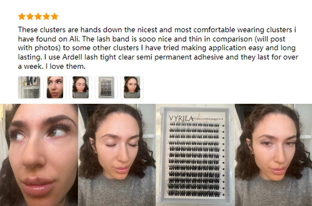𝗘𝗮𝘀𝘆 𝘁𝗼 𝗪𝗲𝗮𝗿 𝗟𝗮𝘀𝗵𝗲𝘀 𝗖𝗹𝘂𝘀𝘁𝗲𝗿 Apply a thin layer of eyelash adhesive to the root of natural eyelashes, gently place the eyelash cluster under the bottom of natural lashes using eyelash adhesive, and then apply a thin layer of eyelash sealant to fix the lash cluster in place and eliminate any residue